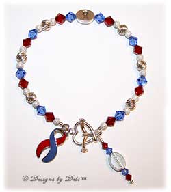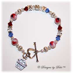 The photos below and in the Memorial Bracelets Gallery are examples. You can choose one of these designs and customize it or we can start from scratch and design something specifically relevant to your situation incorporating elements meaningful to you...birthstones, awareness colors and ribbons, flags, charms, message beads, picture frames... The possibilities are endless.