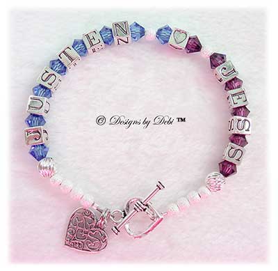 These bracelets are made with Swarovski® crystals and sterling silver. Names are done in 5.8mm sterling silver letter blocks and birthstones are Swarovski® Crystal bicone beads. There are also style options with pearls. There are 12 styles and 90 different bead combinations for you to choose from. You select your favorite combination of beads, the clasp, the charm(s) and the color of the crystals. Birthstones are the most common choice, but you can choose any color you'd like.