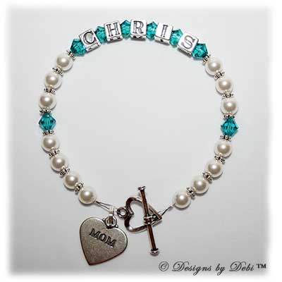 This is the Ali Style Bracelet in the Pearls with Antiqued Daisies bead combination with Blue Zircon (December) crystals, a heart toggle clasp and Mom heart charm. |