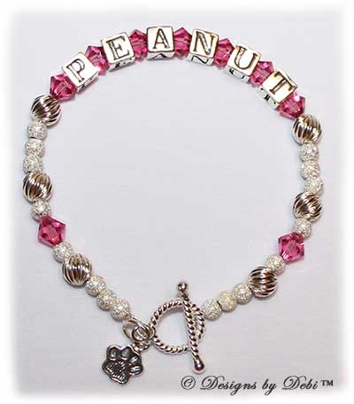 This is a Karen Style Pet Keepsake Bracelet in the Twist and Stardust bead combination with Pink (October) crystals, a bright rope toggle clasp and Paw charm. |